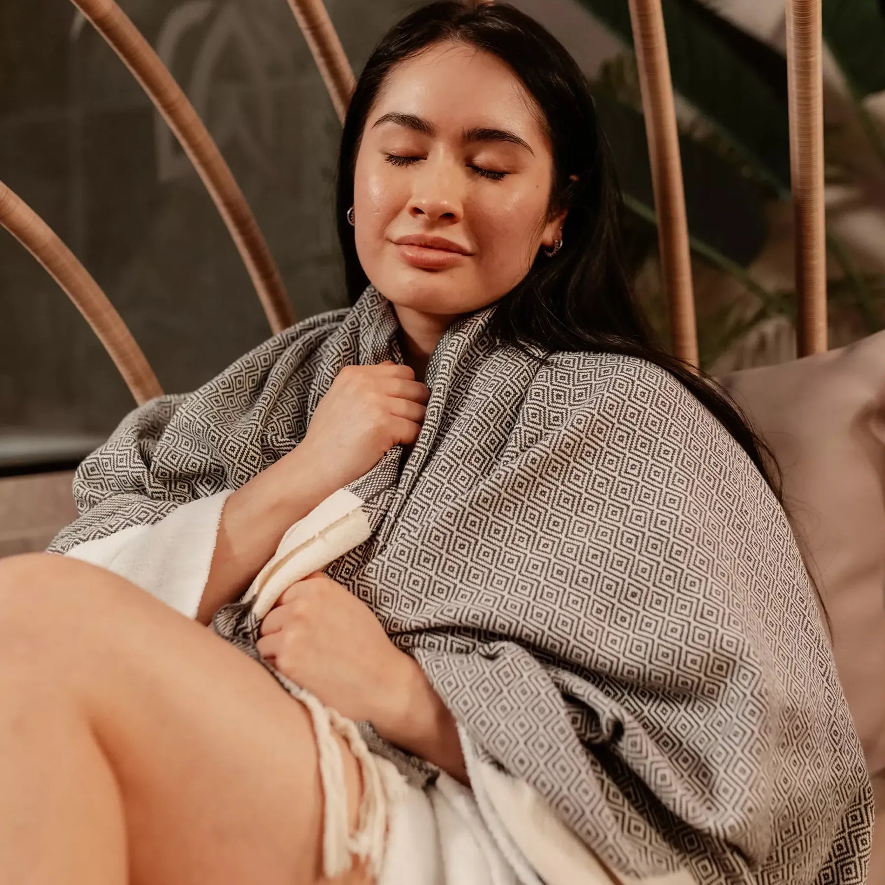 Genieße pure Leichtigkeit: Unser Hamamtuch aus hochwertiger europäischer Baumwolle vereint Stil, Komfort und Nachhaltigkeit. Ob in der Sauna, am Pool, auf der Massageliege oder im Urlaub am Strand – das feine Gewebe ist besonders sanft zur Haut, trocknet schnell und begleitet Dich überall hin.